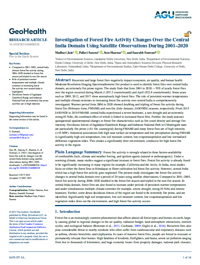 Investigation of Forest Fire Activity Changes Over the Central India Domain Using Satellite Observations During 2001–2020