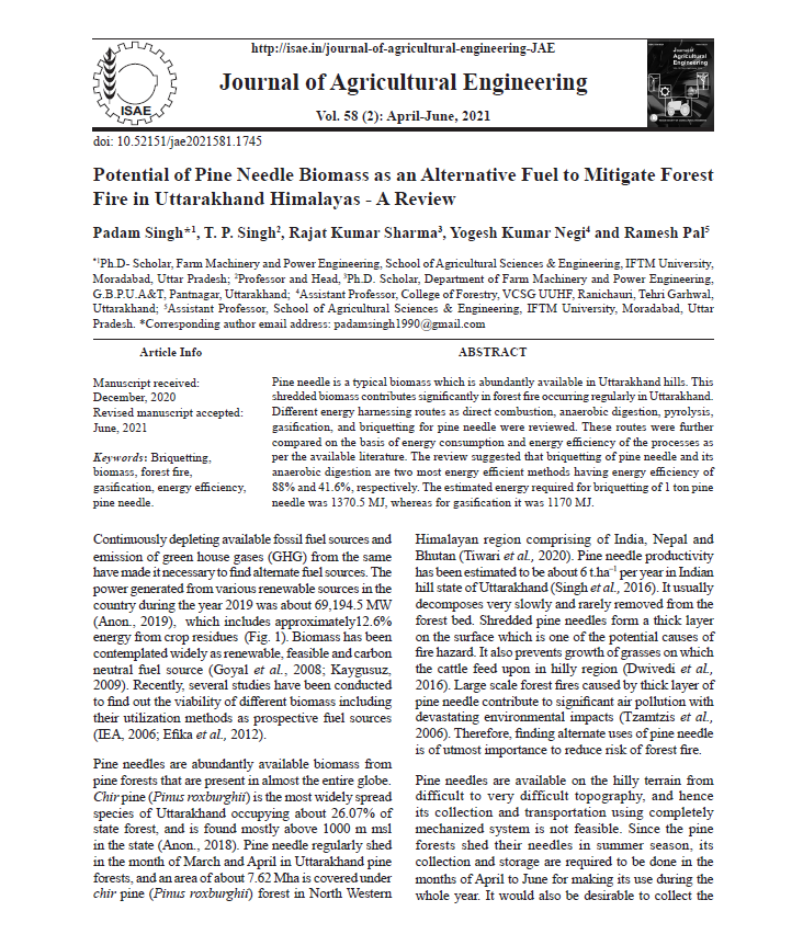 Potential of Pine Needle Biomass as an Alternative Fuel to Mitigate Forest Fire in Uttarakhand Himalayas - A Review
