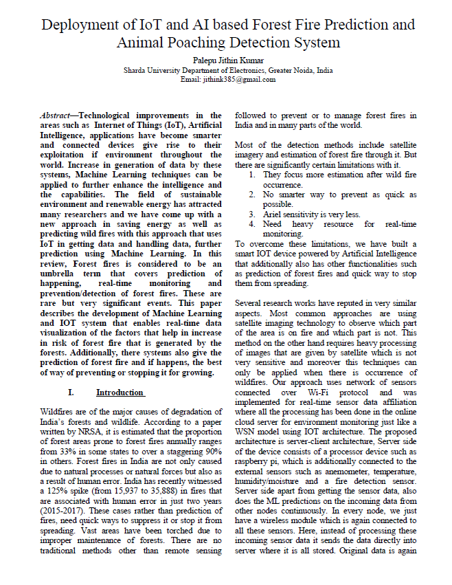 Deployment of IoT and AI based Forest Fire Prediction and Animal Poaching Detection System