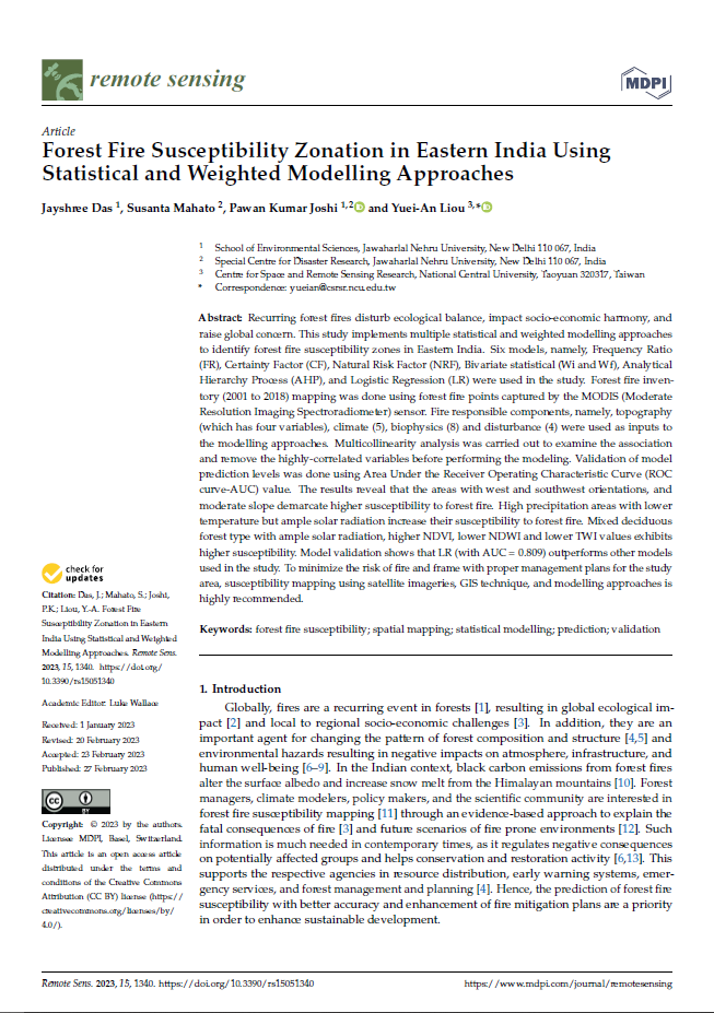 Forest Fire Susceptibility Zonation in Eastern India Using Statistical and Weighted Modelling Approaches